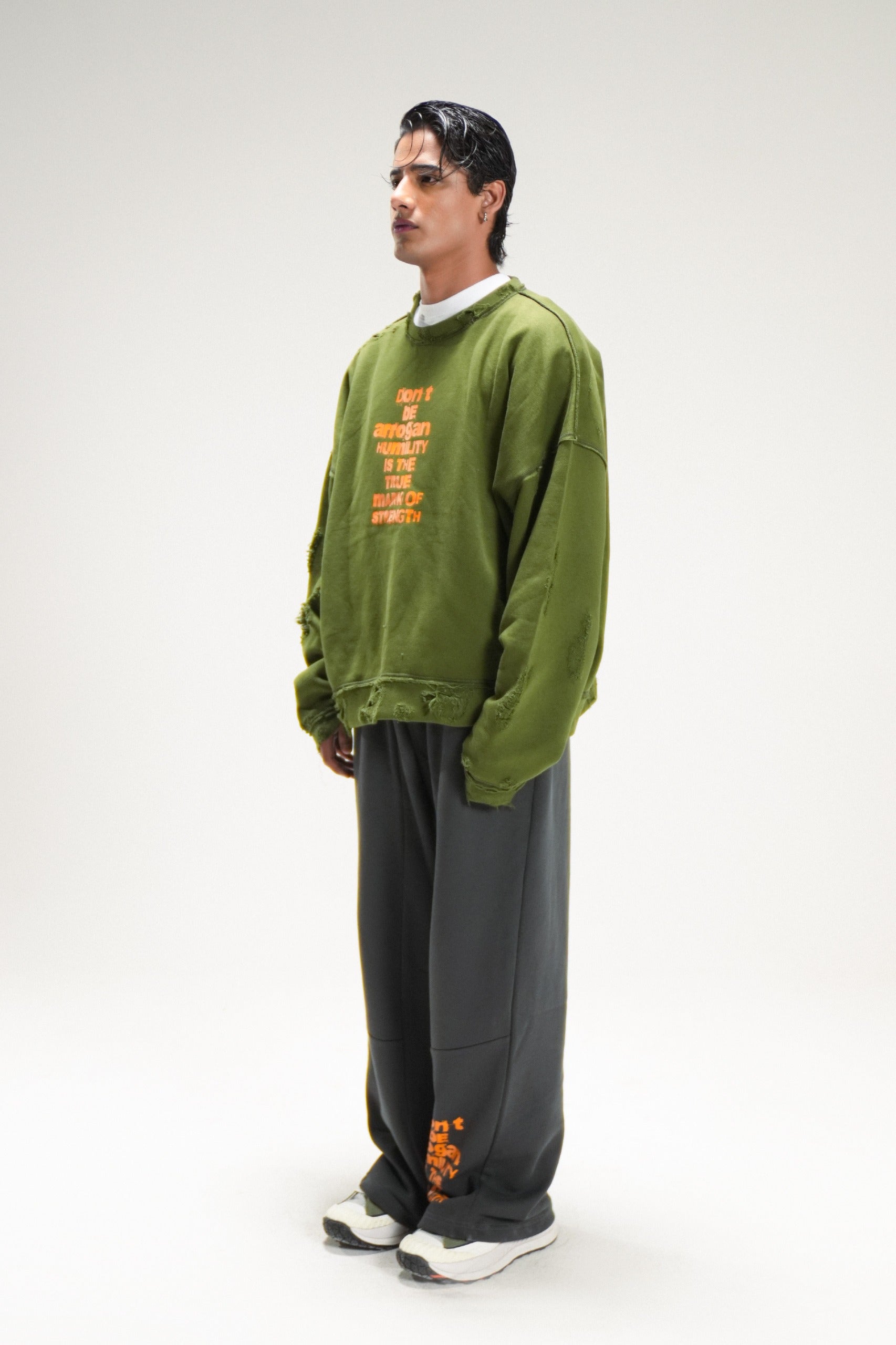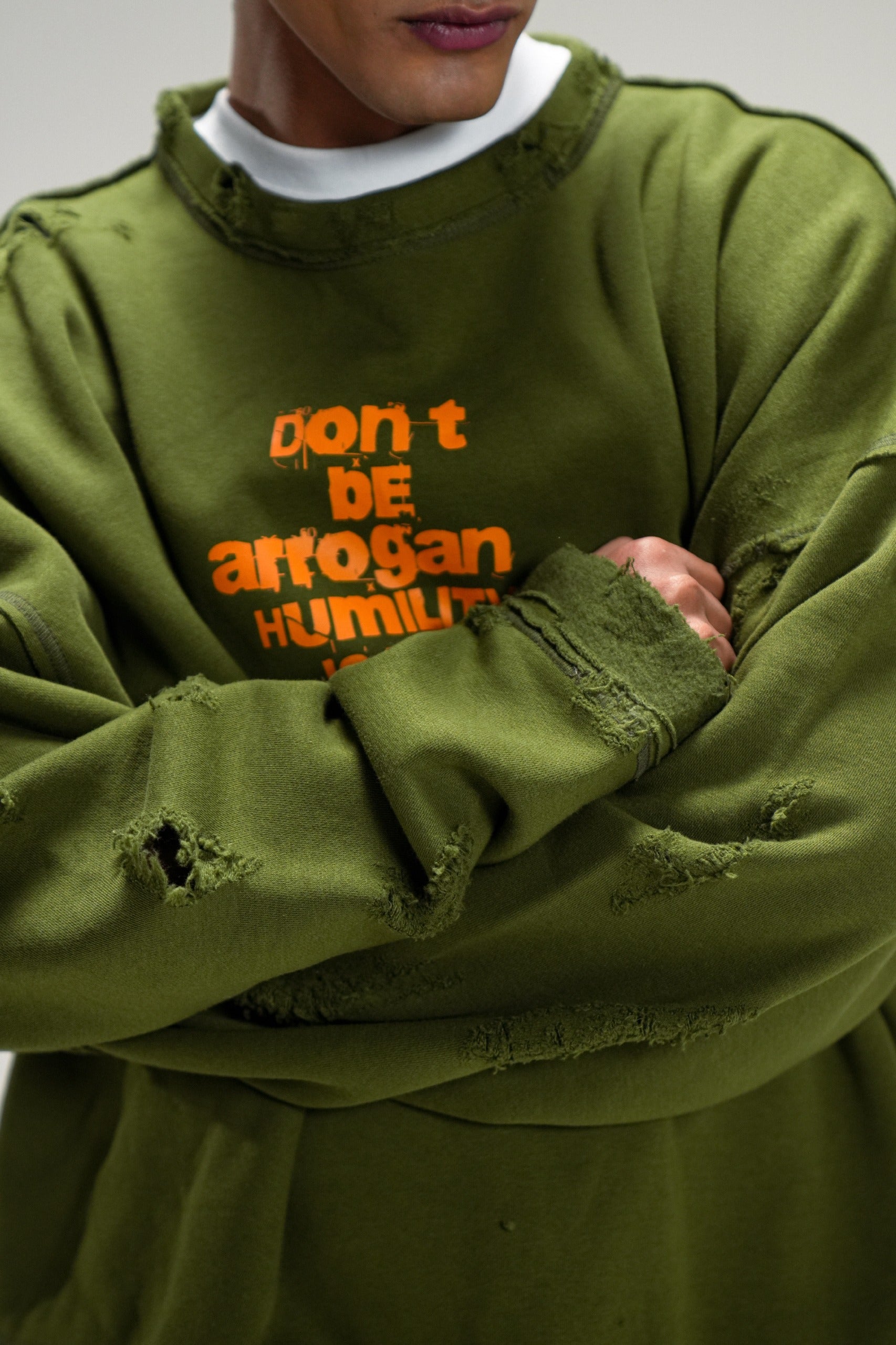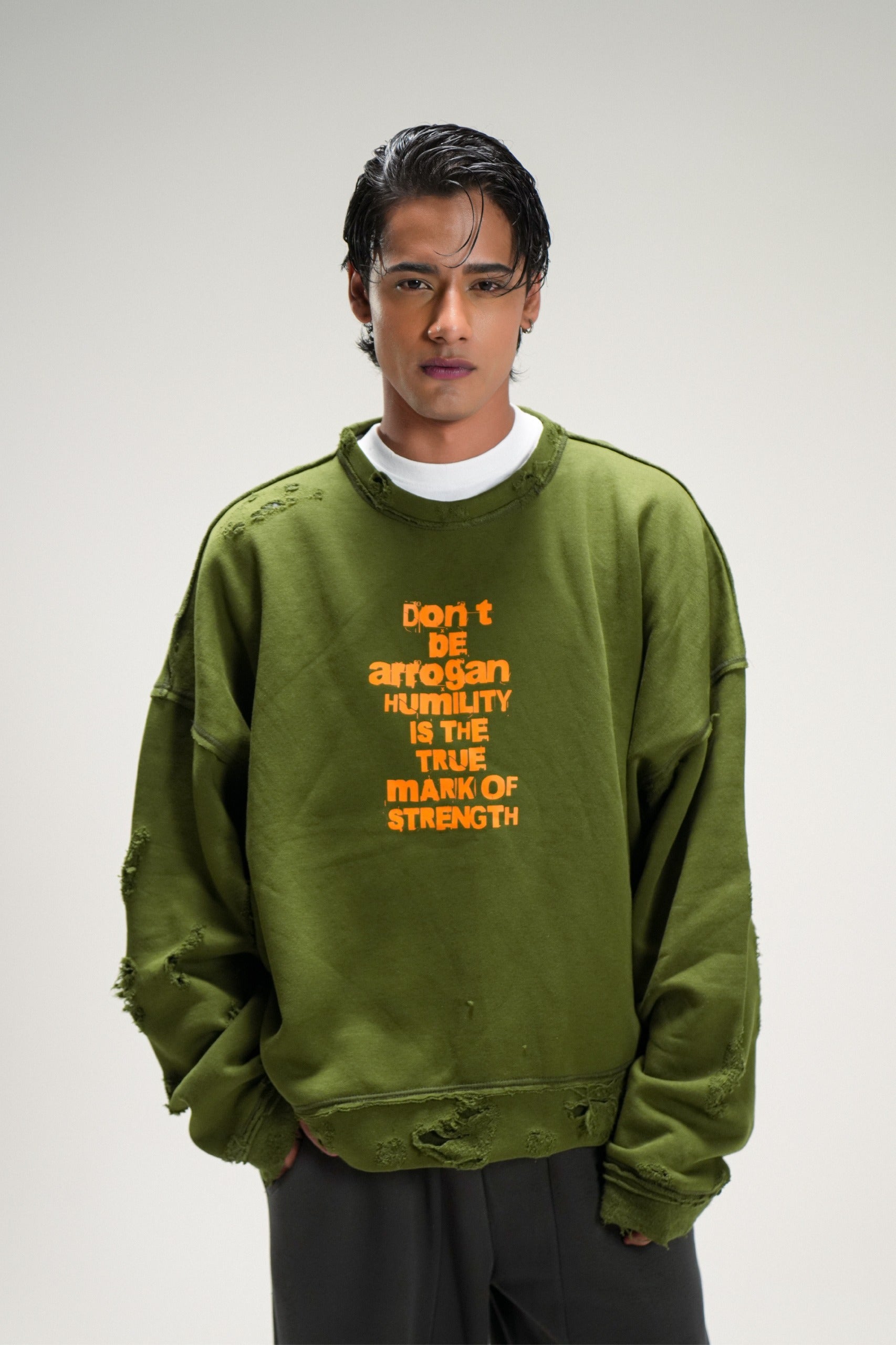 Crafted from heavy, pre-washed olive green fleece, this crewneck features an oversized, boxy fit with visibly distressed details along the neckline, cuffs, and hem, giving it a vintage, worn look. The main design element is the bold, contrasting orange text print across the chest, which reads: "DON'T BE ARROGANT HUMILITY IS THE TRUE MARK OF STRENGTH." It features dropped shoulders and extra-wide ribbed cuffs and hem to emphasize the voluminous shape.